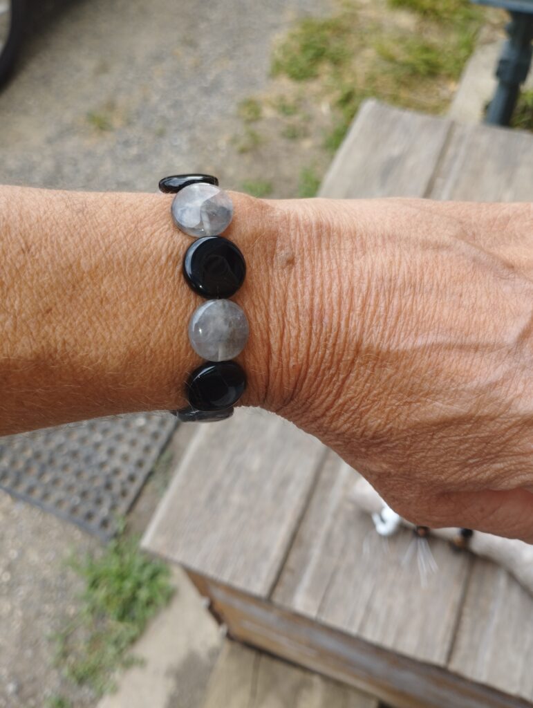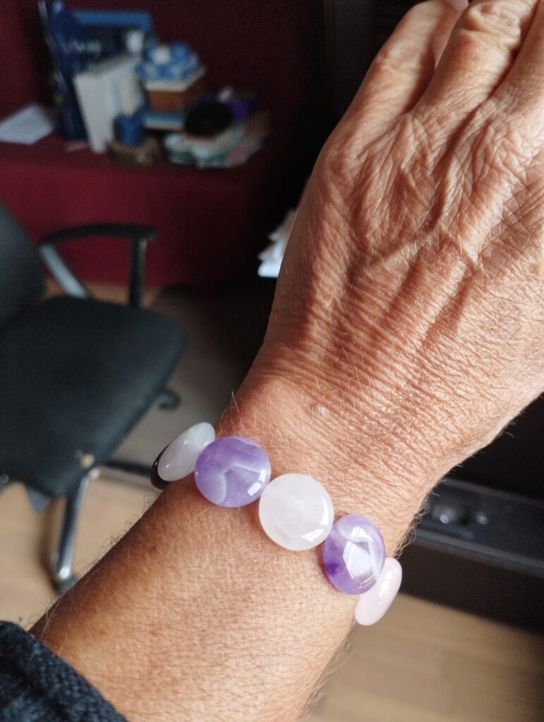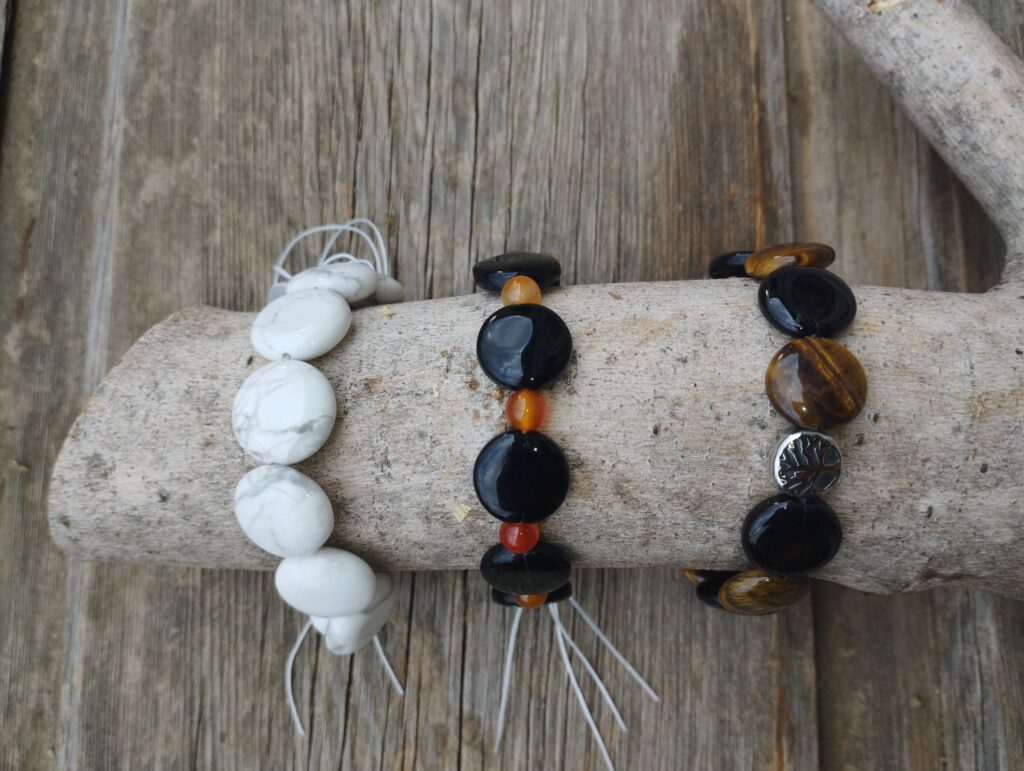 J’utilise plus de 25 pierres différentes et j’utilise principalement des pierres de 10 millimètres (taille au dessus de ce que l’on trouve habituellement). Je fais aussi quelques bracelets avec des pierres de 6 millimètres et nouveauté des bracelets avec des pierres plates et rondes.