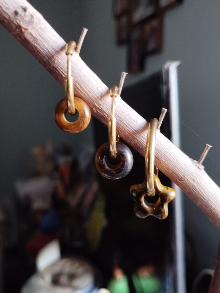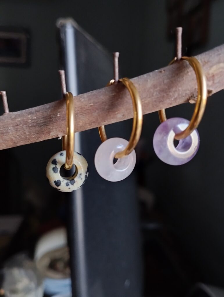 Nouveau, les boucles d’oreilles sont arrivées et des petits colliers sont en préparation (4 ou 5 pierres sur un cordon noir).